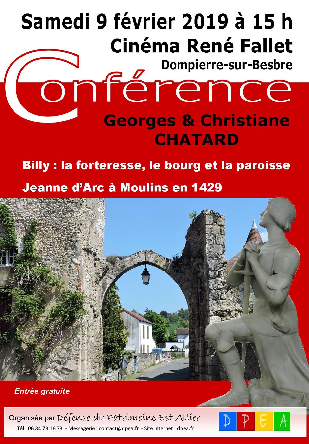 09.02.2019, Conférence de Georges et Christiane Chatard : "Billy, la forteresse, le bourg et la paroisse", "Jeanne d'Arc à Moulins en 1429".